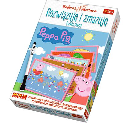 To świetny pomysł na połączenie nauki z zabawą. Zestaw, dzięki możliwości zmazywania, pozwala na swobodne poszukiwanie rozwiązań i wielokrotną zabawę. Doskonała zabawa w domu i przedszkolu, a także podczas podróży.Zestaw kart edukacyjnych bohaterami bajki „Świnka Peppa” do wielokrotnego rysowania ze specjalnym mazakiem. Duże, kolorowe karty z ulubionymi bohaterami zachęcają do rozwiązywania zadań. Podczas wesołej zabawy dzieci nie tylko świetnie bawią się, rysując ale jednocześnie trenują koncentrację, precyzję i logiczne myślenie. Karty są idealnym zestawem do ćwiczeń grafomotorycznych, przygotowujących do nauki pisania.