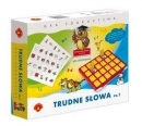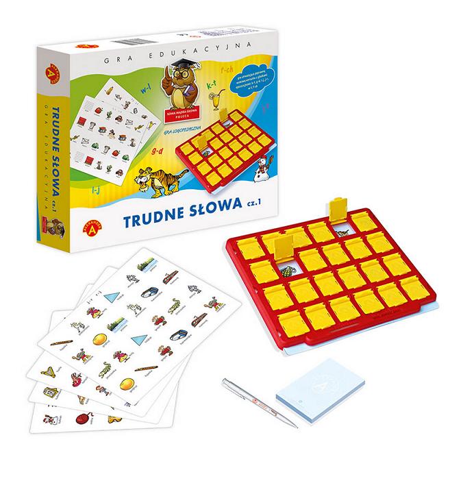 Gra logopedyczna ,,Trudne słowa - cz. 2"" ma na celu rozwój mowy dziecka w wieku przedszkolnym i wczesnoszkolnym w zakresie poprawnego wymawiania głoski ,,r"", w układach opozycyjnych z ,,l"" i ,,j"", poszerzenia słownika czynnego oraz rozwoju percepcji słuchowej. Są to istotne umiejętności w procesie nauki mówienia, czytania i pisania. Podczas gry uczestnicy ćwiczą różnicowanie głosek, a dodatkowo spostrzeganie, pamięć wzrokową, słuchową i koncentrację uwagi. Grę można wykorzystać do zabawy w domu z rodzicami, w szkole, w pracy terapeutycznej z logopedą. Gracz, na którego przyszła kolej otwiera 2 klapki plastikowej tablicy. Wyraźnie wymawia nazwy odkrytych obrazków. Istotne jest, aby uczestnik wymówił je prawidłowo. Za prawidłowe samodzielne powiedzenie nazwy, gracz otrzymuje 2 punkty. Za odkrycie pary takich samych obrazków uczestnik otrzymuje dodatkowo 1 punkt. Wygrywa ten, kto zdobędzie najwięcej punktów.