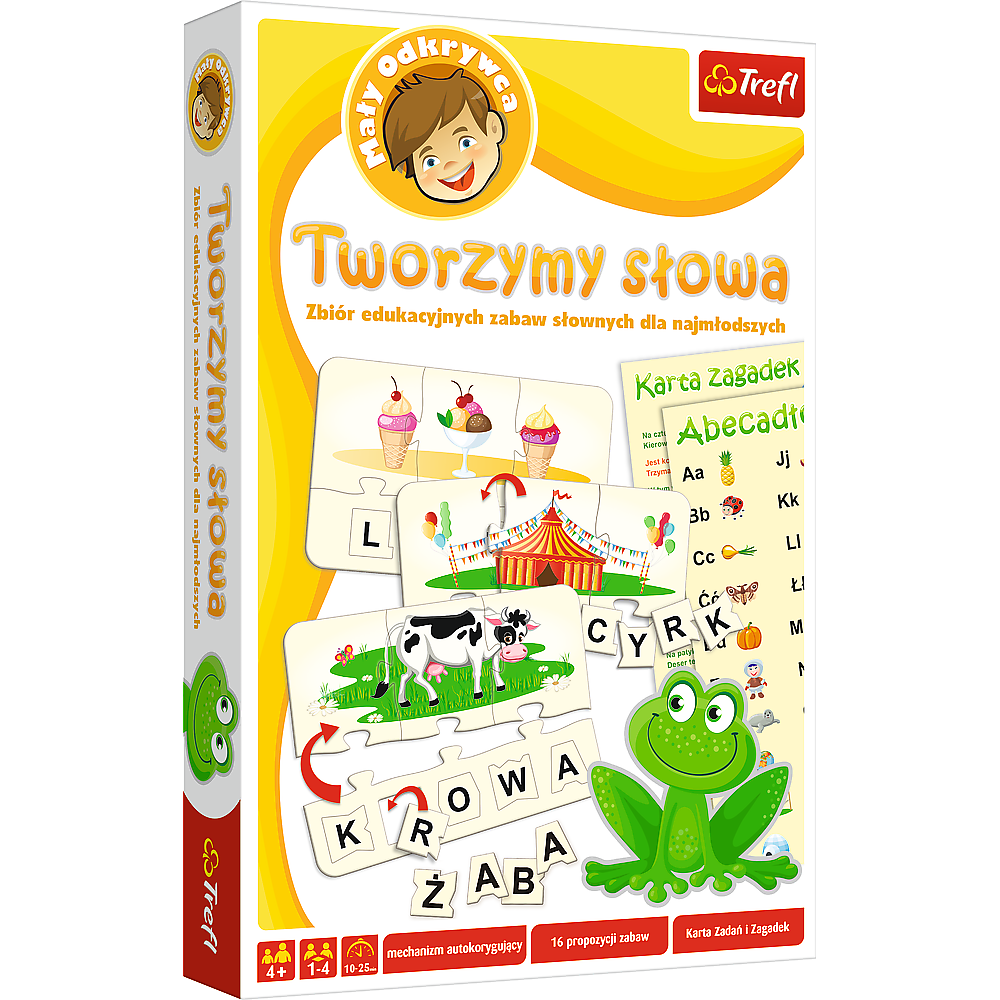 Opakowanie zawiera 16 puzzlowych obrazków z podpisem złożonym z liter, które układamy pod wyrazem za pomocą mechanizmu autokorygującego, Kartę Zadań i Zagadek oraz instrukcję z wieloma propozycjami zabaw.