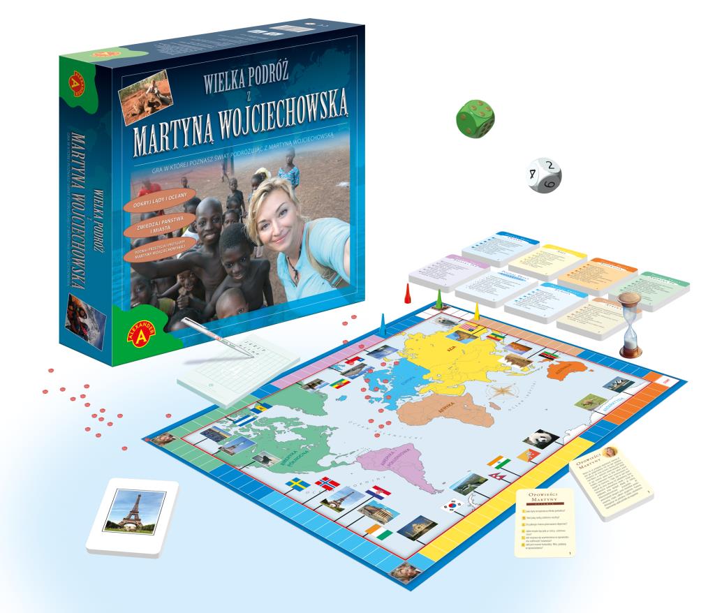 Gra, której uczestnicy przemierzają świat razem ze znaną podróżniczką, Martyną Wojciechowską. Pokonując oceany i kontynenty odpowiadają na pytania związane z miejscami postoju. Podczas wędrówki gracze mogą poznać również ciekawe historie, łączące się z różnymi miejscami na kuli ziemskiej, które przeżyła i opisała specjalnie dla nich Martyna Wojciechowska. Gra Wielka podróż z Martyną Wojciechowską to emocjonująca zabawa dla całej rodziny i jednocześnie bogate źródło ciekawych informacji o świecie.