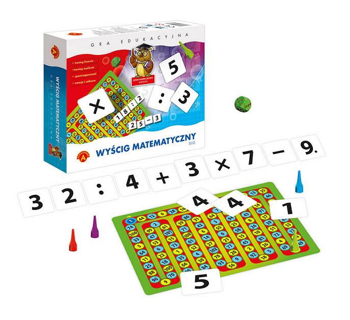 Wyścig matematyczny- big""- emocjonująca gra i znakomity trening szybkiego liczenia. Z rozłożonych na stole liczb i znaków matematycznych należy ułożyć jak najszybciej działanie, którego wynik będzie zgodny z liczbą pola planszy, na którym stanie pionek. Gra zapewnia dobrą zabawę, uczy szybkiego liczenia i spostrzegawczości.