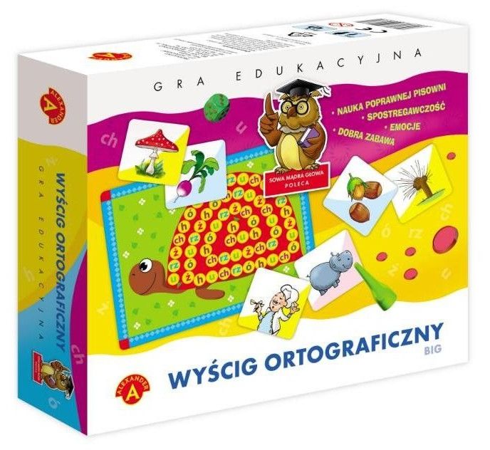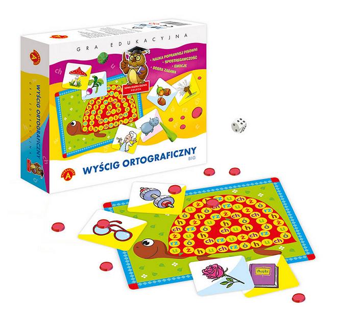 W grze "Wyścig ortograficzny" wygrywa ten, kto najszybciej odnajdzie, wśród tabliczek leżących na stole, obrazek zawierający w nazwie literę z pola, na którym zatrzymał się pionek. W trakcie zabawy dzieci poznają i utrwalają sobie właściwą pisownię wyrazów z "rz", "ż", "ch", "h", "ó" i "u". Gra jest również świetnym treningiem spostrzegawczości i refleksu dla młodszych i starszych graczy.