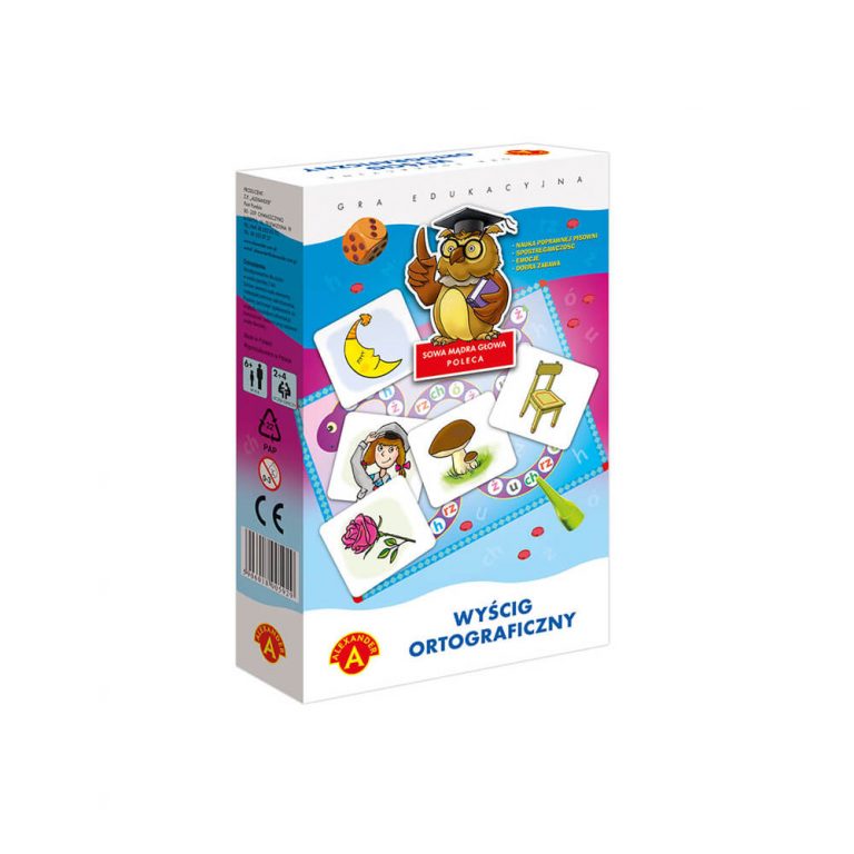 W grze "Wyścig ortograficzny" wygrywa ten, kto najszybciej odnajdzie, wśród tabliczek leżących na stole, obrazek zawierający w nazwie literę z pola, na którym zatrzymał się pionek. W trakcie zabawy dzieci poznają i utrwalają sobie właściwą pisownię wyrazów z "rz", "ż", "ch", "h", "ó" i "u". Gra jest również świetnym treningiem spostrzegawczości i refleksu dla młodszych i starszych graczy.