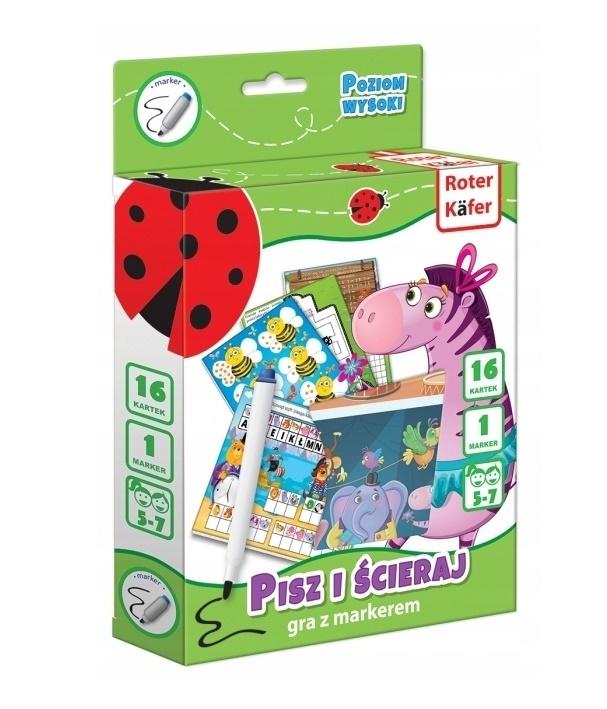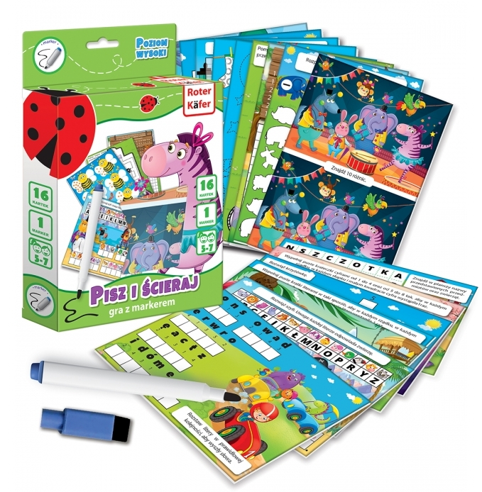 Gra z markerem: pisz i ścieraj (poziom wysoki). Wybierz kartkę, która ci odpowiada.Wykonuj zadania przy pomocy markera.Ścieraj marker gąbką i znów maluj do woli.