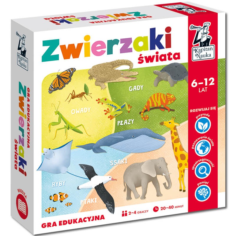 Gra edukacyjna „Zwierzaki świata” to fantastyczna przygoda dla dzieci w wieku 6–12 lat, w czasie której ścigają się o zwycięstwo, poznają zwierzęta z 6 królestw i ćwiczą spostrzegawczość oraz refleks.
