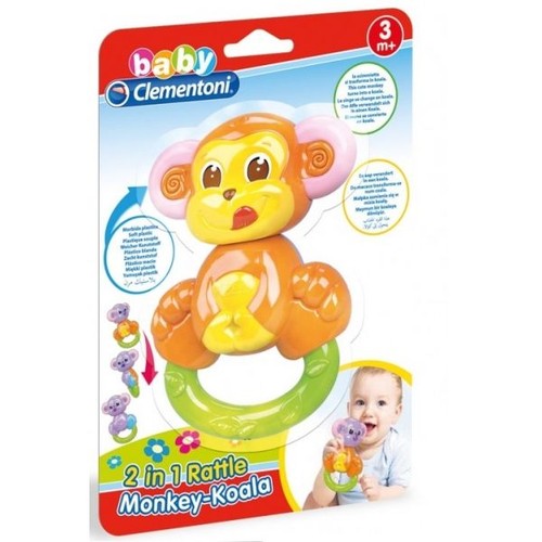 Dwa zwierzątka w jednej grzechotce: śliczna małpka z jednej strony, a milutki miś koala z drugiej. Można uzyskać wiele kombinacji przez okręcanie głowy i tułowia.