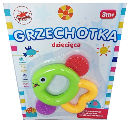 Zabawka wspomaga naukę chwytania i wrażliwość na dźwięk.