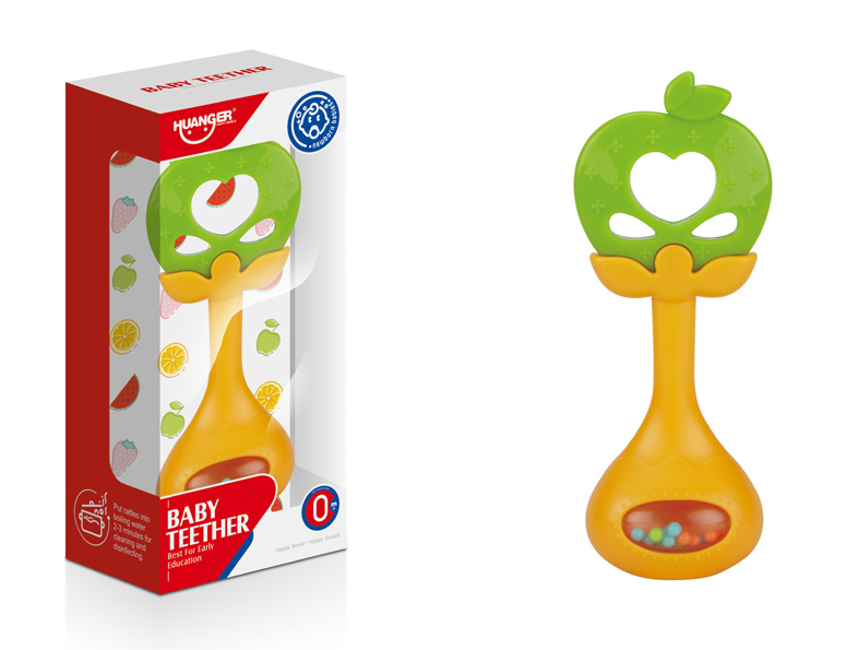 Kolorowy gryzak w kształcie jabłka z grzechotką o wysokości 14 cm.