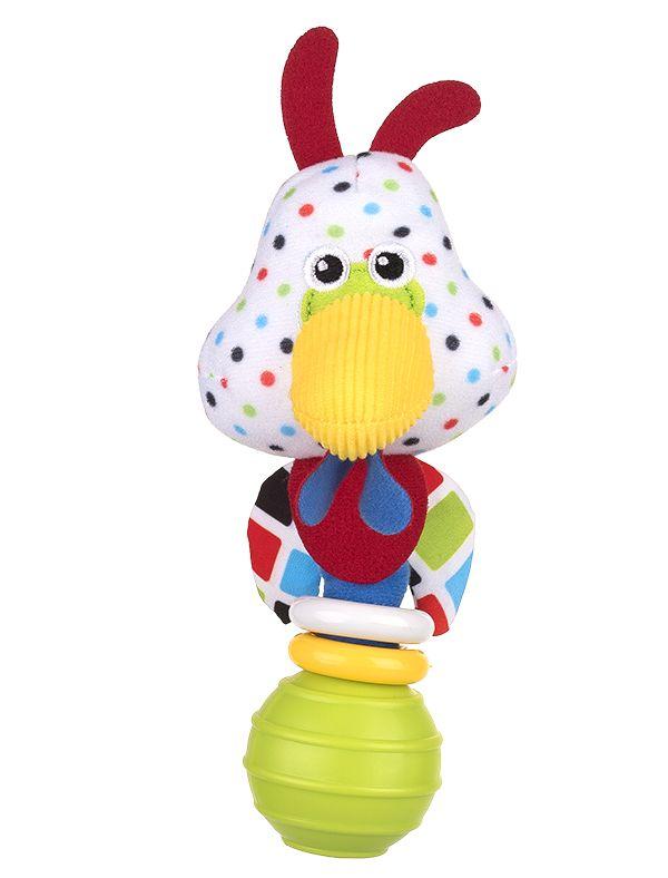 Papuga Polly, jak na papugę przystało, to barwna osobowość w świecie pluszakowej ferajny. Gdy tylko bobas nią potrząśnie, papuga zakołysze się na boki przy dźwiękach grzechotania. Jej piórka zdobią kontrastowe wzory. Polly całymi dniami przesiaduje na zielonej kuli, której nieregularna faktura ułatwia maluchom chwytanie zabawki.