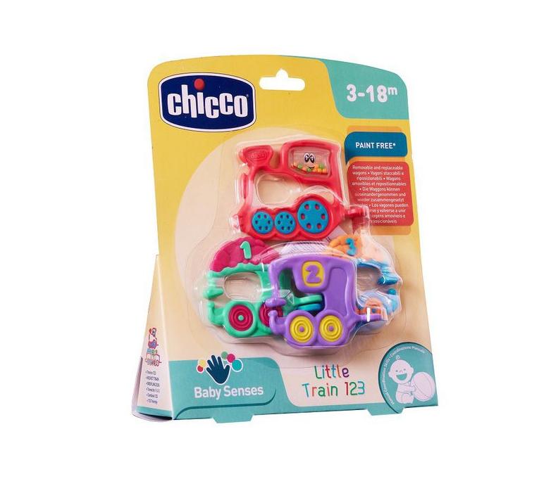 Żywe kolory i ciekawe faktury! Grzechotka Pociąg to lekka i łatwa do trzymania grzechotka, idealna dla dzieci w pierwszych miesiącach życia. Grzechotka składa się z 4 zawieszek w kształcie wagonu. Żywe, kontrastowe kolory przyciągają uwagę dziecka. Zabawka stymuluje umiejętności manualne dziecka.
