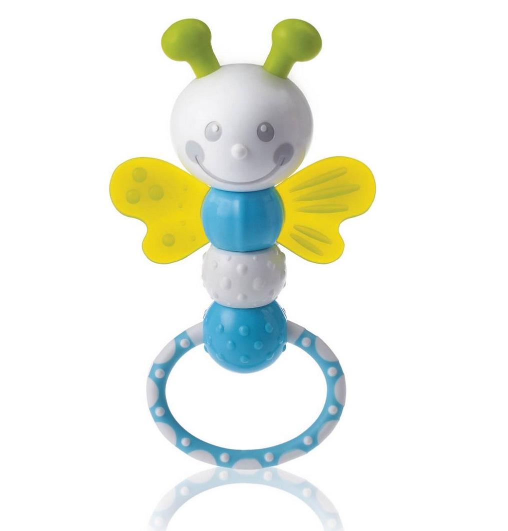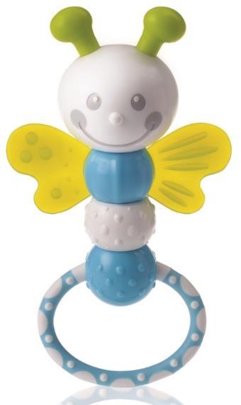 Uśmiechnięta grzechotka w kształcie pszczółki w pięknych kolorach. Zabawka delikatnie dzwoni przy potrząsaniu, a dzięki 6 różnym powierzchniom gryzienia przyniesie ulgę obolałym dziąsełkom.