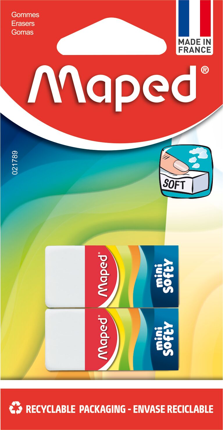 Miękka biała gumka, niewielkich rozmiarów, zapewniająca bardzo wysoki komfort użycia. Ściera nie naruszając struktury papieru. Owinięta w ruchomą kartonową osłonkę, chroniącą przed zabrudzeniem. Blister 2 sztuki