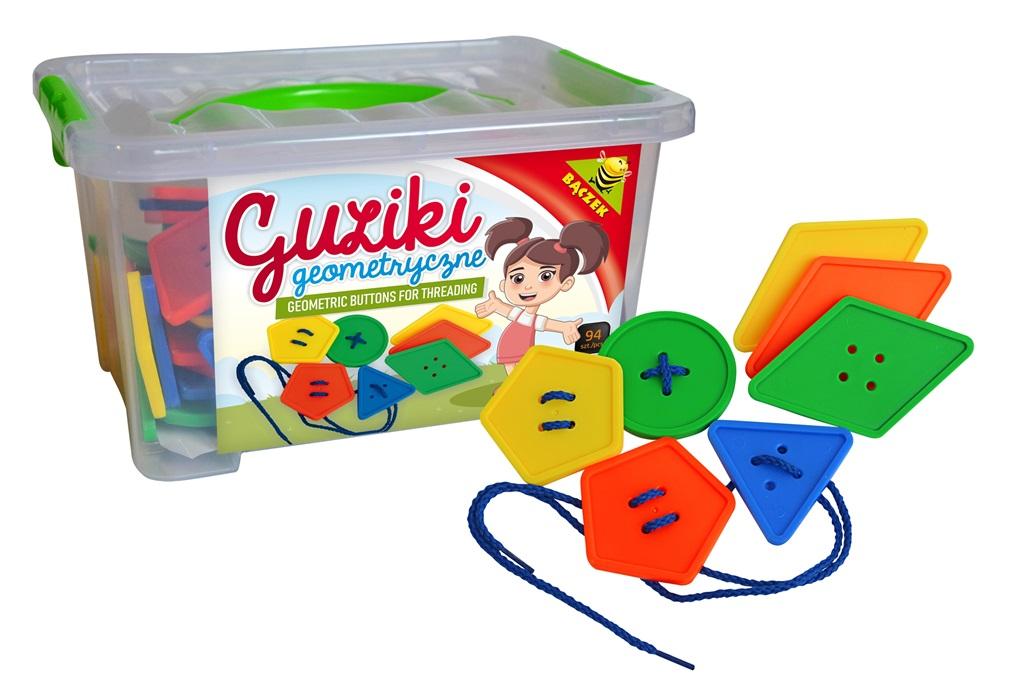 Zestaw guzików do nawlekania zawierający 106 elementów. Guziki występują w 4 kolorach o różnej ilości dziurek i różnej wielkości. Guziki zachęcą Twoje dziecko do wielu kreatywnych zabaw: do nawlekania, układania, grupowania, sortowania i przesypywania. Guziki świetnie sprawdzą się również podczas nauki kolorów. Guziki genialnie wpływają na sprawności dłoni i palców, usprawniają precyzję ruchów, ćwiczą koncentrację oraz pobudzają kreatywność dziecka.W zestawie znajdują się sznureczki oraz ich zakończenia – korki. Dzięki korkom nawleczone guziki zatrzymują się na jednym końcu sznurka, ułatwiając dalsze nawlekanie młodszym dzieciom.