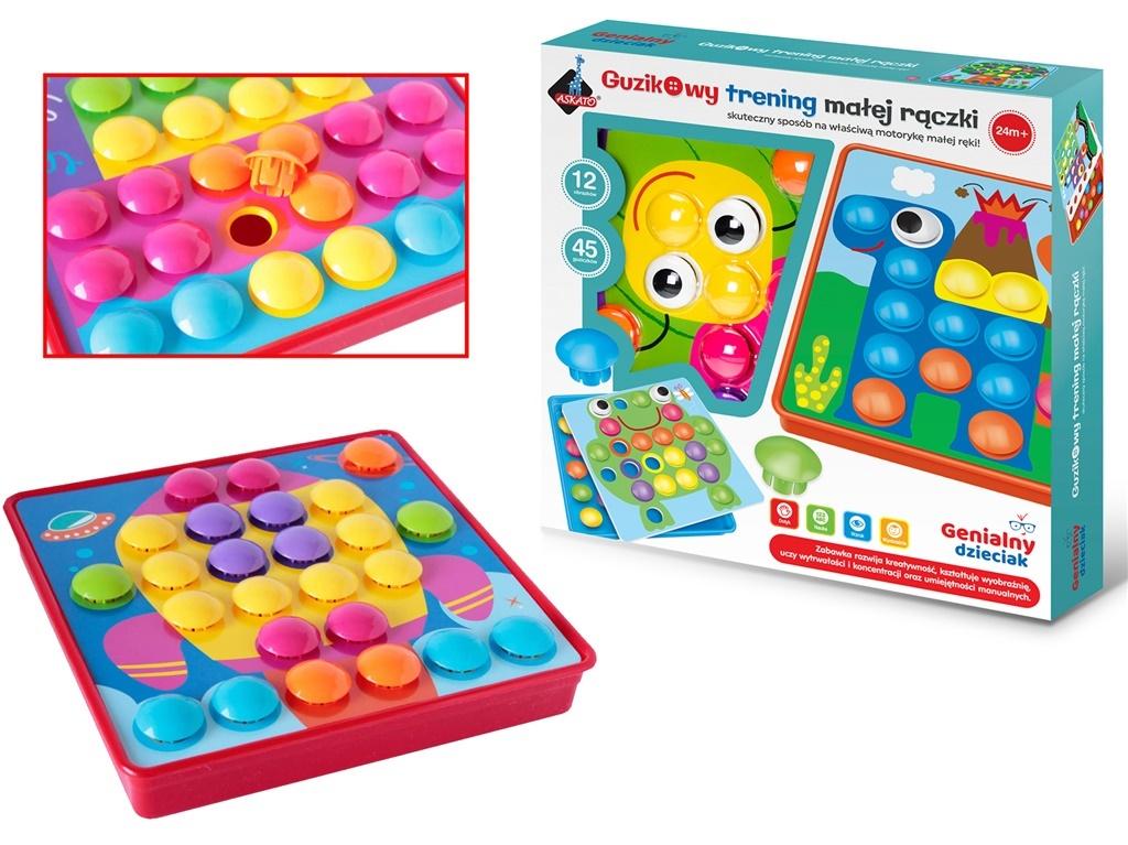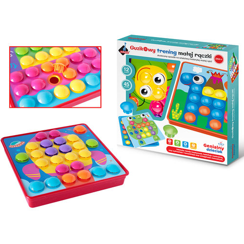 Ta wspaniała zabawka nauczy twoje dziecko, kształtów i kolorów. Guzikowy Trening rozwija wyobraźnię, oraz myślenie przestrzenne, które jest tak ważne w rozwoju każdego dziecka.Układanka guziczki to zabawka rozwijająca kreatywność małych dzieci, kształtująca wyobraźnię, ucząca wytrwałości i koncentracji oraz umiejętności manualnych.Układanka stymuluje motorykę małej ręki - sprawność dłoni i paluszków. Zestaw zawiera wygodne pudełko do przechowywania, aż 45 kolorowych guzików i 12 różnych wymiennych plansz do umieszczenia na specjalnym pudełku z dziurkami, na których układamy guziczki.Żywe kolory oraz różnorodność obrazków zachęca dziecko do zabawy i uczy nazywania i rozpoznawania kolorów.