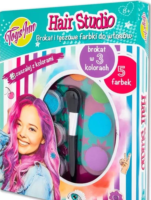 Zestaw zawiera zmywalne 3 farbki w 3 kolorach do włosów i 3 kolory brokatu.