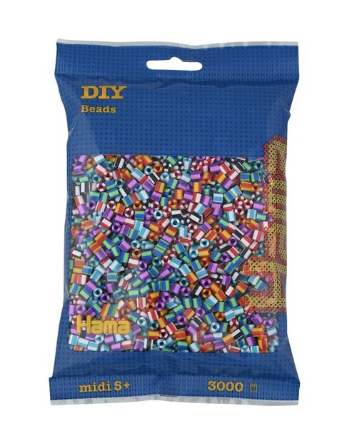 Koraliki Midi w woreczku to zestaw uzupełniający, zawierający 3000 szt. prążkowanych dwukolorowych koralików. Zestaw ten daje możliwość dopracowania własnych wzorów, pozwala tworzyć bardziej szczegółowe i dokładne obrazki. Koraliki Midi to oryginalny produkt marki Hama, produkowany w Danii, posiadający wszelkie niezbędne badania i atesty. Ich średnica to 5 mm.
