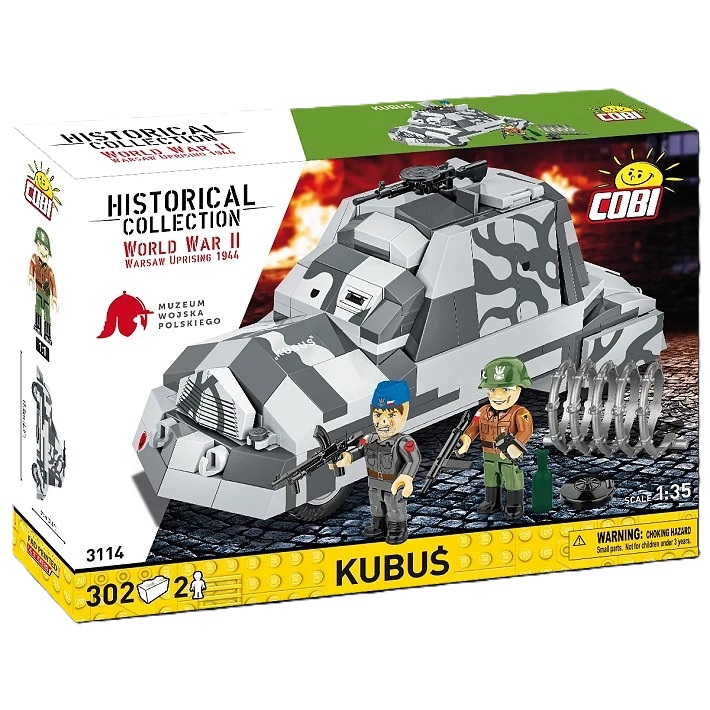 Cobi-3114 KUBUŚ HISTORICAL COLLECTION WORLD WAR II 302 klocków 2 figurkI Grupa wiekowa 7+ Skala 1:35 Kubuś to polski improwizowany samochód pancerny, który został zbudowany przez powstańców warszawskich w sierpniu 1944 roku podczas Powstania Warszawskiego. Pojazd ten powstał w zaledwie kilka dni, w warsztacie przy ul. Tamka. Do jego budowy wykorzystano podwozie ciężarówki Chevrolet 157 oraz blachy stalowe, które miały chronić załogę przed ogniem nieprzyjaciela. Kubuś, uzbrojony w karabiny maszynowe, brał udział w kilku akcjach bojowych, w tym w nieudanym ataku na Uniwersytet Warszawski. Po zakończeniu powstania Kubuś cudem przetrwał wojnę i obecnie jest eksponowany w Muzeum Wojska Polskiego w Warszawie jako symbol odwagi i pomysłowości powstańców warszawskich! Razem z Muzeum Wojska Polskiego postanowiliśmy uczcić 80. rocznicę wybuchu Powstania Warszawskiego! Przygotowaliśmy wyjątkowy klockowy zestaw z legendarnym samochodem powstańczym "Kubuś"! Klockowy model w skali 1:35 zawiera nadruki oraz wszystkie najważniejsze cechy swojego pierwowzoru znajdującego się w Muzeum Wojska Polskiego w Warszawie. Nie zapomnieliśmy nawet o tak mało znanym detalu, jak emblemat Kolumny Motorowej Wydra, który znajdował się na zderzaku! Nasz model został wyposażony w karabin maszynowy DP-28. Górny właz można otworzyć, aby umieścić w nim figurkę. Nie każdy wie, że do Kubusia wsiadało się przez otwór w podłodze! Zaznaczyliśmy w modelu to nietypowe wejście! Do zestawu dołączone są dwie figurki przedstawiające powstańców warszawskich. W szarym kombinezonie, z biało-czerwoną opaską na prawym ramieniu, z naszywką "Wydry" na lewym i niebieskiej furażerce przedstawiliśmy żołnierza z Kolumny Motorowej Wydra, która była częścią Zgrupowania Krybar. Drugi z żołnierzy należy do plutonu "Rafałki". To, co ich wyróżniało spośród innych formacji to używanie jako emblematów niemieckich saperskich żółtych trójkątnych proporczyków z trupią czaszką, które stanowiły oznaczenie dla terenu zaminowanego bądź skażonego chemicznie. Symbol ten znajduje się na lewym ramieniu żołnierza. Na hełmie z boku białą farbą namalowana jest litera "R" charakterystyczna dla tej formacji. Obie figurki zostały wyposażone w akcesoria takie jak: pistolet maszynowy STEN, ręczny karabin maszynowy Bren, granat ręczny i minę. W zestawie znajduje się również butelka oraz fragment drutu kolczastego. Powstanie warszawskie wybuchło 1 sierpnia 1944 roku i trwało aż do 3 października. Było zbrojnym wystąpieniem polskiego ruchu oporu, głównie Armii Krajowej, przeciwko okupującym Warszawę wojskom niemieckim. Celem powstania było wyzwolenie stolicy przed nadejściem Armii Czerwonej, aby zapewnić suwerenność Polski po wojnie. Mimo początkowych sukcesów, powstańcy nie zdołali utrzymać swoich pozycji w obliczu przeważających sił niemieckich i braku dostatecznej pomocy z zewnątrz. Po 63 dniach zaciętych walk powstanie zostało stłumione. Zginęło około 16 tysięcy powstańców i około 150-200 tysięcy cywilów, a miasto zostało niemal doszczętnie zniszczone. Powstanie warszawskie pozostaje symbolem polskiego heroizmu i patriotyzmu. 302 wysokiej jakości elementy wyprodukowane w UE przez firmę z ponad 20-letnią tradycją, spełniają normy bezpieczeństwa dotyczące produktów dla dzieci, w pełni kompatybilne z innymi markami klocków konstrukcyjnych, klocki z nadrukami nie odkształcają się i nie bledną w czasie zabawy czy pod wpływem temperatury, model czołgu, dwie figurki, akcesoria, Wymiary modelu (dł x wys): 17,5 cm (6.9") x 9 cm (3.5")