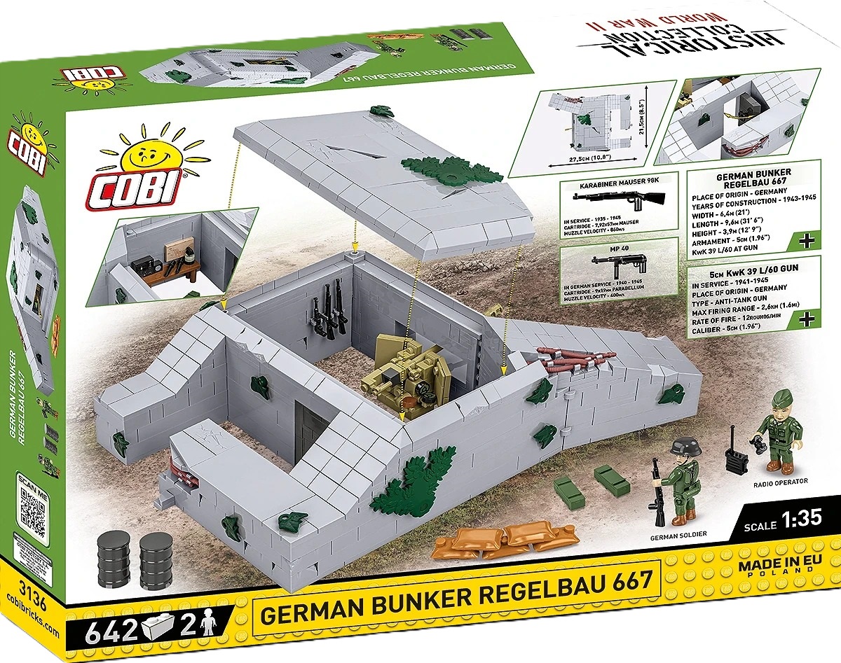 COBI-3136 Regelbau 667 - German Bunker HISTORICAL COLLECTION WWII 642 elementów 2 figurki Grupa wiekowa: 8+ Skala: 1:35 Schron Regelbau 667 został zaprojektowany z myślą o ochronie niemieckich żołnierzy przed spodziewaną inwazją aliantów. Jego głównym celem było zapewnienie schronienia i bezpieczeństwa nie tylko żołnierzom, ale także cennemu sprzętowi wojskowemu, który był niezbędny do prowadzenia działań wojennych. Dzięki solidnej konstrukcji z betonu i stali zbrojeniowej bunkier był odporny na ostrzał artyleryjski oraz bombardowania, co czyniło go niezwykle trudnym do zniszczenia. Takie umocnienia miały na celu nie tylko obronę przed bezpośrednim atakiem, ale także zapewnienie przewagi strategicznej w trudnych warunkach wojny. Zbudowanie modelu Regelbau 667 od COBI to nie tylko zabawa w klockowe modelarstwo, ale także głębsze zrozumienie historycznego kontekstu, w którym te bunkry miały swoje miejsce. Zalety zestawu Regelbau 667 - German Bunker: Skala 1:35 - Bunkier Regelbau 667 w skali 1:35 zapewnia niesamowitą dokładność, pozwalając na stworzenie w pełni funkcjonalnego modelu. Realistyczne figurki - W zestawie znajdują się dwie figurki: niemieckiego żołnierza i radiooperatora, które dodają realizmu i mogą być wykorzystywane w dioramach, scenkach bitewnych lub po prostu jako element dekoracyjny. Otwierany dach - Model posiada otwierany dach, co pozwala na wgląd do wnętrza bunkra. Dodatki uzupełniające - Model schronu uzupełniają dodatki, takie jak roślinne maskowanie, beczki na prowiant czy worki z piaskiem. Dodatkowo w bunkrze mamy armatę przeciwczołgową KwK 39L, radiostacje, granaty i karabiny typu MP-40 i Mauser Kar98k. Zestaw jest idealny dla miłośników dioram wojennych, kolekcjonerów modeli i każdego, kto pasjonuje się historią! Zbuduj swój własny bunkier Regelbau 667 i odkryj fascynujący świat umocnień wojennych!