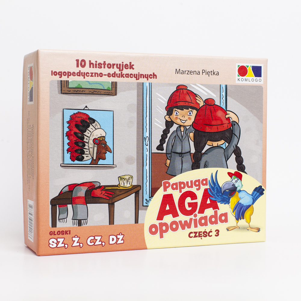 Papuga Aga opowiada. Część 3 - sz, ż, cz, dż to zestaw 10 historyjek obrazkowych 4-elementowych, które można wykorzystać w terapii logopedycznej i zabawach ogólnorozwojowych dzieci w wieku przedszkolnym i wczesnoszkolnym.