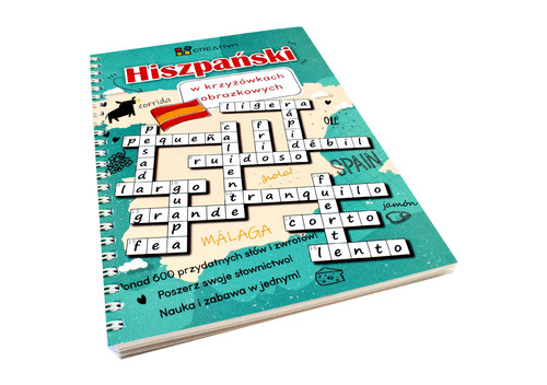 Zastosowana metoda obrazkowa znacznie przyśpiesza naukę słownictwa. Poprzez kojarzenie nowych słów z obrazkami uczymy się o wiele szybciej. Książka zawiera ponad 600 podstawowych słów i zwrotów i stanowi świetną pomoc dla osób zaczynających przygodę z językiem hiszpańskim. Książka wydana jest w formie kołonotatnika co bardzo udogadnia uzupełnianie ćwiczeń oraz rozwiązywanie krzyżówek. Liczba stron:148