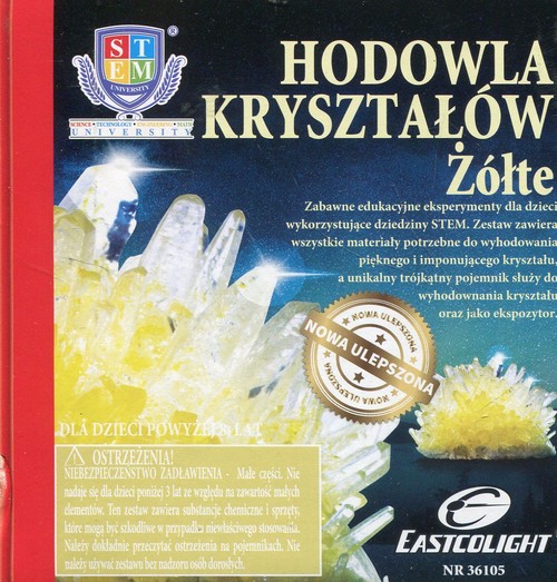 Ciekawy zestaw do eksperymentów dla dzieci. Unikalny trójkątny kształt pojemnika i ekspozytora. Zawiera wszystko co potrzebne do wyhodowania zielonego kryształu. Zawartość: fiolka z proszkiem krystalicznym w kolorze źółtym (fosforan monoamonowy), trójkątny ekspozytor z pokrywką, baza kryształu, łyżeczka, instrukcja.
