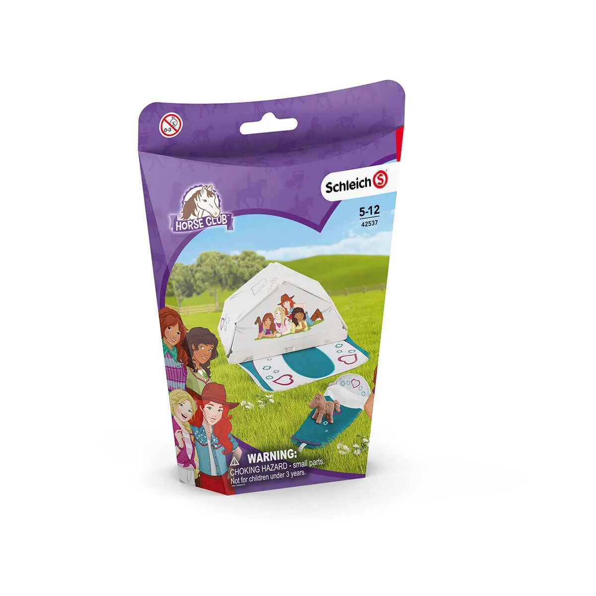 Dzięki akcesoriom kempingowym z serii Schleich(R) Horse Club wyprawa na łono natury stanie się dla dziewcząt z klubu jeździeckiego wspaniałym przeżyciem. Ich przestronny namiot rozkłada się w oka mgnieniu, a mięciutki śpiwór zapewnia przyjemny sen. Do tego milutki konik przytulanka otuli ich głowy, jak miękka chmurka. Zestaw zawiera dodatkowo piękną dużą derkę dla konia.