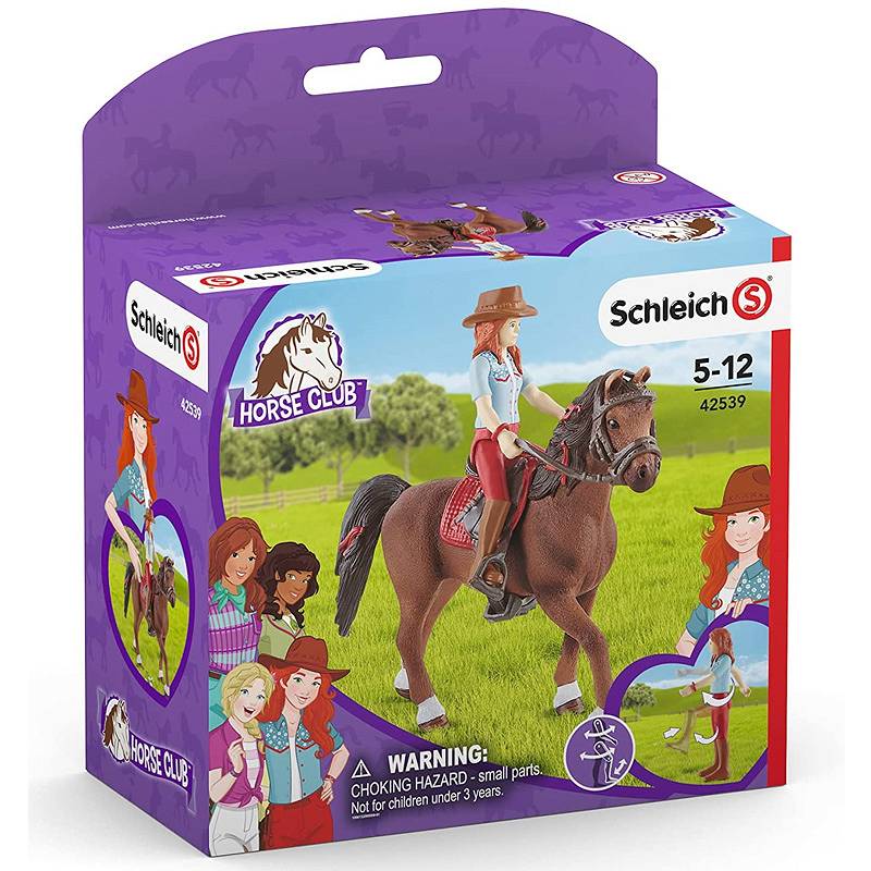 Hannah i Cayenne z klubu jeździeckiego z serii Schleich(R) Horse Club to niepokonany zespół. Zawsze trzymają się razem! Całkowicie ruchoma figurka Hanny potrafi nie tylko stać, lecz także zginać nogi, by wejść na wałacha rasy quarter horse Cayenne. W zestawie znajdują się również uzda, cugle i siodło do jazdy westernowej. Ten rodzaj jazdy to wielka pasja Hanny. Czerwona bransoletka, którą nosi, jest symbolem głębokiej przyjaźni między przyjaciółkami z klubu jeździeckiego.
