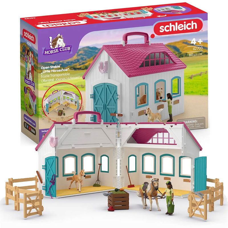 Schleich Horse Club oferuje idealne warunki do zabawy dla miłośników koni. Ta stajnia pozwala na pomysłową zabawę wokół tematów pielęgnacji koni i życia w stajni. Jest kompatybilny z innymi zestawami Schleich Horse Club, dzięki czemu można go idealnie zintegrować z istniejącymi światami zabawy. Idealny do kreatywnego odgrywania ról i zanurzenia się w świecie koni.