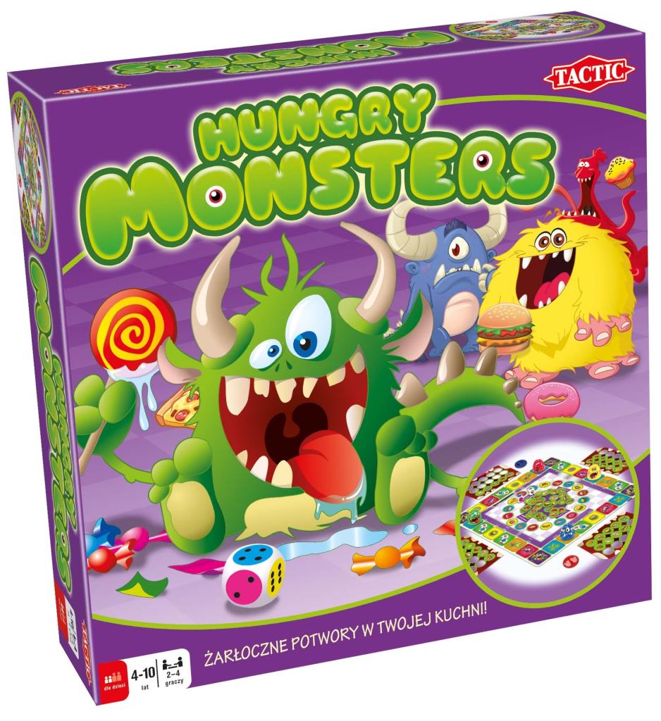 POTWORY LUBIĄ JEŚĆ!Hungry Monsters to gra dla łakomczuchów w każdym wieku!Potwory są głodne, a głód ten zaspokoić nie jest łatwo. Krążą więc po kuchni w poszukiwaniu pysznych kąsków.Zadaniem każdego zawodnika jest zapełnienie paszczy jednego potwora. Potwory przemieszczają się po planszy, a gracze wykonują zadania, dzięki którym zdobywają krążki z jedzeniem dla swoich podopiecznych...Zawartość: Plansza, 4 potwory (+naklejki), 4 paszcze potworów, 60 żetonów, 2 kostki (+1 arkusz z naklejkami), zasady.Gra przeznaczona dla 2-4 osób w wieku 4-10 lat