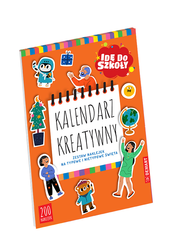 Kalendarz kreatywny to zestaw 32 kart z mnóstwem naklejek do wykorzystania z okazji typowych i nietypowych świąt w ciągu całego roku szkolnego: rozpoczęcia roku szkolnego, Międzynarodowego Dnia Kropki, pierwszego dnia astronomicznej jesieni, zimy, wiosny i lata, Dnia Chłopaka, Światowego Dnia Drzewa, Dnia Edukacji Narodowej, Święta Dyni i Halloween, Dnia Wszystkich Świętych, Narodowego Święta Niepodległości, Światowego Dnia Pluszowego Misia, mikołajek, Bożego Narodzenia, Nowego Roku, Dnia Wiedzy o Pingwinach, Dnia Babci i Dnia Dziadka, Międzynarodowego Dnia Pizzy, tłustego czwartku, walentynek, Światowego Dnia Kota, Dinozaura, Dnia Piegów, Międzynarodowego Dnia Kobiet, Światowego Dnia Zespołu Downa, Międzynarodowego Dnia Teatru, Wielkanocy, Światowego Dnia Świadomości Autyzmu, Światowego Dnia Czekolady, Dnia Ziemi, Dnia Flagi Rzeczpospolitej Polskiej i Narodowego Święta Konstytucji 3 Maja, Międzynarodowego Dnia Strażaka, Światowego Dnia Kosmosu, Dnia Matki i Dnia Ojca, Dnia Dziecka, Dnia Przyjaciela i wakacji.