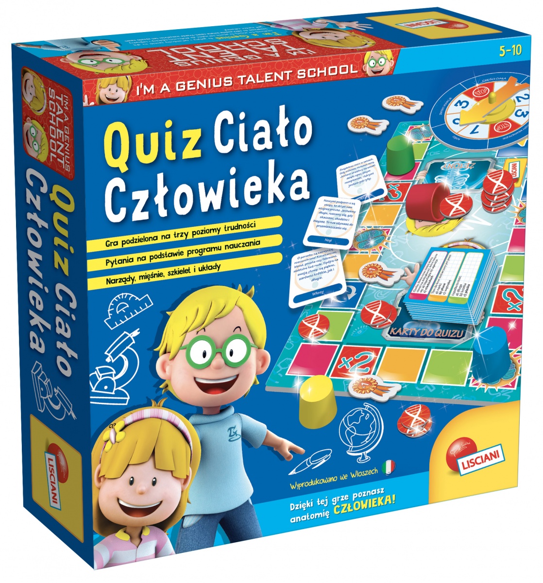 Gra stworzona na zasadzie quizu,opracowana na podstawie programu szkoły podstawowej, dzięki której dzieci poznają budowę ciała człowieka oraz jego narządy. Gra jest podzielona na trzy poziomy trudności. Zawartość: 48 kart, 4 pionki, spinner, plansza, żetony, odznaki.