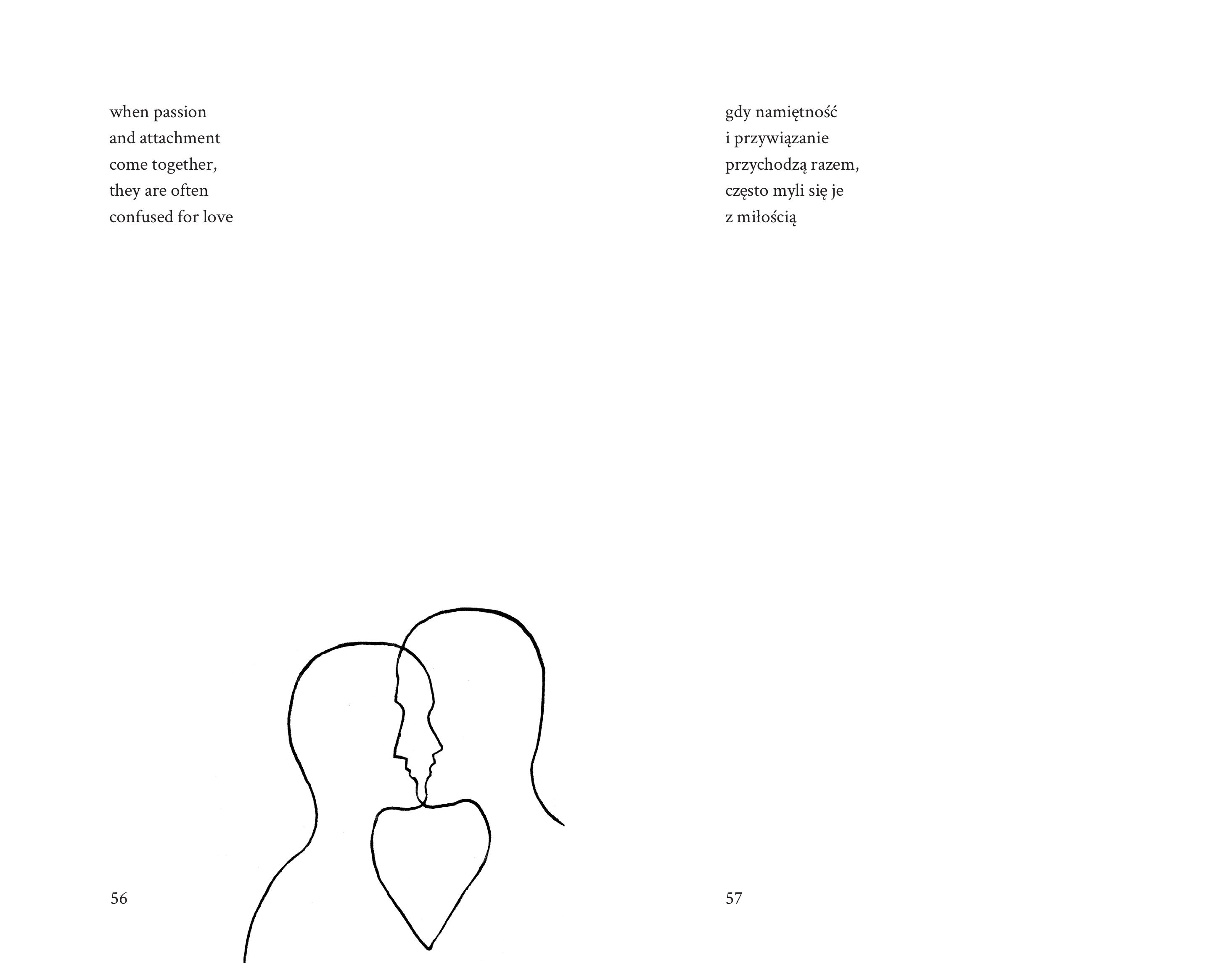 Na kartkach tomiku znajdziemy bardzo minimalistyczne, czarno-białe rysunki, które fajnie współgrają z jego zawartością i niewątpliwie dodają mu uroku. Wiersze w większości są bardzo krótkie, niektóre ograniczają się dosłownie do 3-5 wyrazów. Po za tym na kartkach z lewej strony mamy wersję angielską, a z prawej polską, więc mimo że książka ma dobrze ponad 400 str. czyta się ją bardzo szybko. Właściwie bez większych problemów można skończyć ją za pierwszym podejściem.