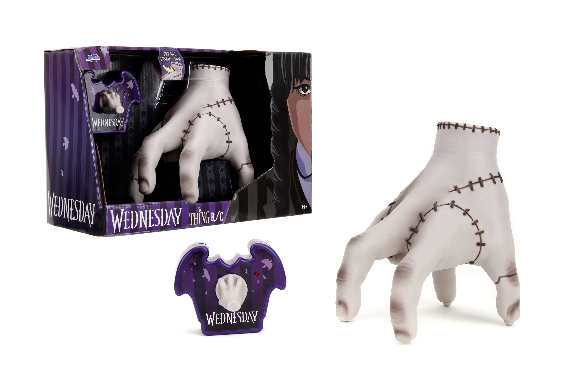 Sterowana 2-kanałowym radiem figurka jednego z głównych bohaterów serialu Wednesday - Rączka. Chodzi, porusza palcami. Ładowana na kabel