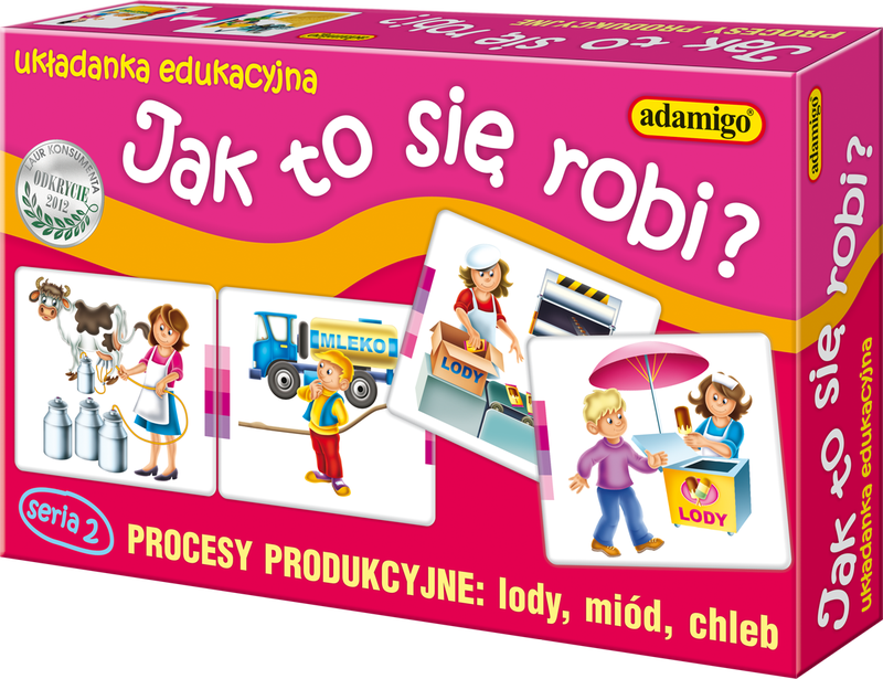 Zestaw zawiera 15 plakietek z rysunkami 3 cykli produkcyjnych. Aby ułożyć prawidłowo 5 plakietek w proces produkcyjny, trzeba o tym porozmawiać z mamą, tatą albo dziadkiem. Sprawdzisz sam, czy ułożyłeś właściwie dzięki barwnym znakom na bokach plakietek. Powodzenia.
