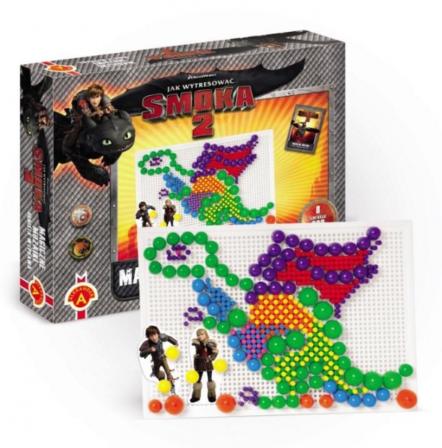 Jak Wytresować Smoka 2! Magiczne mozaiki 800 elementów, produkt licencjonowany Drem Works. Układaj kształty z kolorowych elementów. Wersja dla zaawansowanych. ""MAGICZNE MOZAIKI 800 SMIKI 2 OGNISTA WYPRAWA"" to kreatywna zabawa dla dzieci, młodzieży i dorosłych.Do Waszej dyspozycji oddana zostaje plansza z mnóstwem otworów, w których należy umieścić różnej wielkości kolorowe elementy, by stworzyć rozmaite wzory i obrazy. Istnieje niemal nieskończona ilość kombinacji, a po wykonaniu ilustracji wystarczy,że wyjmiecie elementy i możecie zacząć od nowa.Do zestawu dołączony jest album zawierający ponad 100 inspiracji, Zabawa ćwiczy kreatywność i wyobraźnię.Zestaw zawiera 800 kołeczków o śr. 15 mm 488 szt, 23 mm 212 szt, 30 mm 100 szt.