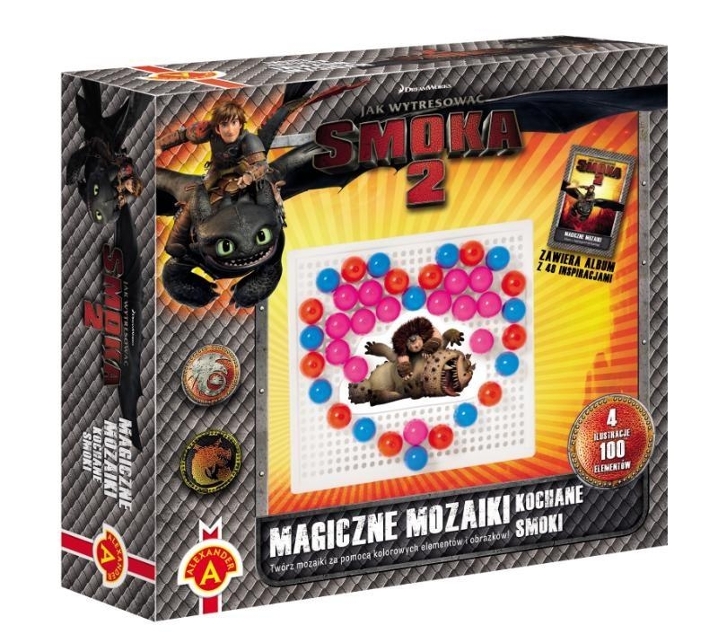Magiczne mozaiki 100 elementów. Produkty licencjonowane Drem Works,JAK WYTRESOWAĆ SMOKA 2. ""MAGICZNE MOZAIKI 100 SMOKI 2 KOCHANE SMOKI"" to kreatywna zabawa dla dzieci, młodzieży i dorosłych.Do Waszej dyspozycji oddana zostaje plansza z mnóstwem otworów, w których należy umieścić różnej wielkości kolorowe elementy, by stworzyć rozmaite wzory i obrazy. Istnieje niemal nieskończona ilość kombinacji, a po wykonaniu ilustracji wystarczy,że wyjmiecie elementy i możecie zacząć od nowa.Do zestawu dołączony jest album zawierający ponad 24 inspiracje, Zabawa ćwiczy kreatywność i wyobraźnię .Zestaw zawiera 110 kołeczków o śr. 23 mm 100 szt, 30 mm 10 szt.