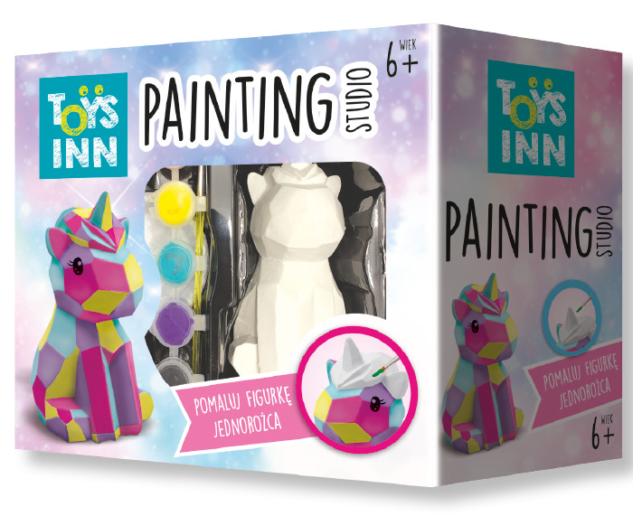 Zestaw zawiera figurkę jednorożca do malowania, 5 farbek, pędzelek i dwie tacki do mieszania farb. Produkt przeznaczony dla dzieci w wieku 6+.