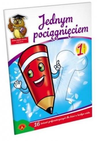 Jednym pociagnięciem"" to seria zeszytów zawierających ćwiczenia grafomotoryczne. Przygotowują one dzieci do nauki pisania, uczą prawidłowego trzymania narzędzi do pisania, stosowania właściwej siły nacisku. Zeszyty mają różne stopnie trudności.