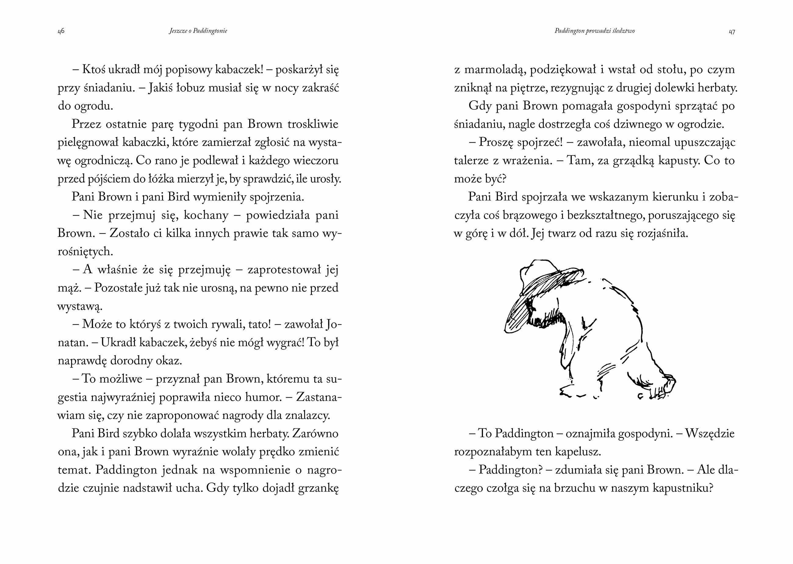 Paddington, elegancki niedźwiadek w kapeluszu, przybysz z dalekiego Peru, już wie, że kanapka z marmoladą najlepiej smakuje we własnym domu. Zwłaszcza gdy przygotuje ją pani Bird. Dla rodziny Brownów miś byłby w stanie zrobić wszystko! Więc gdy ginie ważna rzecz pana Henry'ego, Paddington rusza z pomocą. Czy w sercu niedźwiadka jest dość odwagi, by w ciemną noc przeprowadzić śledztwo w poszukiwaniu złodziejaszka?