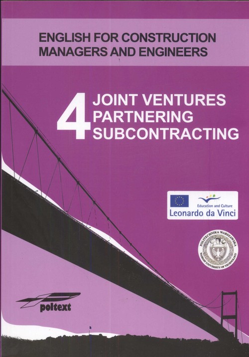 Do książki dołączony został dodatek płatny w postaci płyty CD. Oddajemy do rąk czytelników czwarty z ośmiu tomów podręczników do nauki fachowego języka angielskiego dla wykładowców i studentów uczelni technicznych, inżynierów, projektantów, konstruktorów i menedżerów działających w szeroko pojętym sektorze budownictwa. Poświęcony jest problematyce organizowania wspólnych przedsięwzięć budowlano-inwestycyjnych, m.in. realizowanych ze środków UE, informacji biznesowej oraz tworzenia konsorcjów firm budowlanych. Zawiera także przykładowe umowy pomiędzy stronami porozumień.