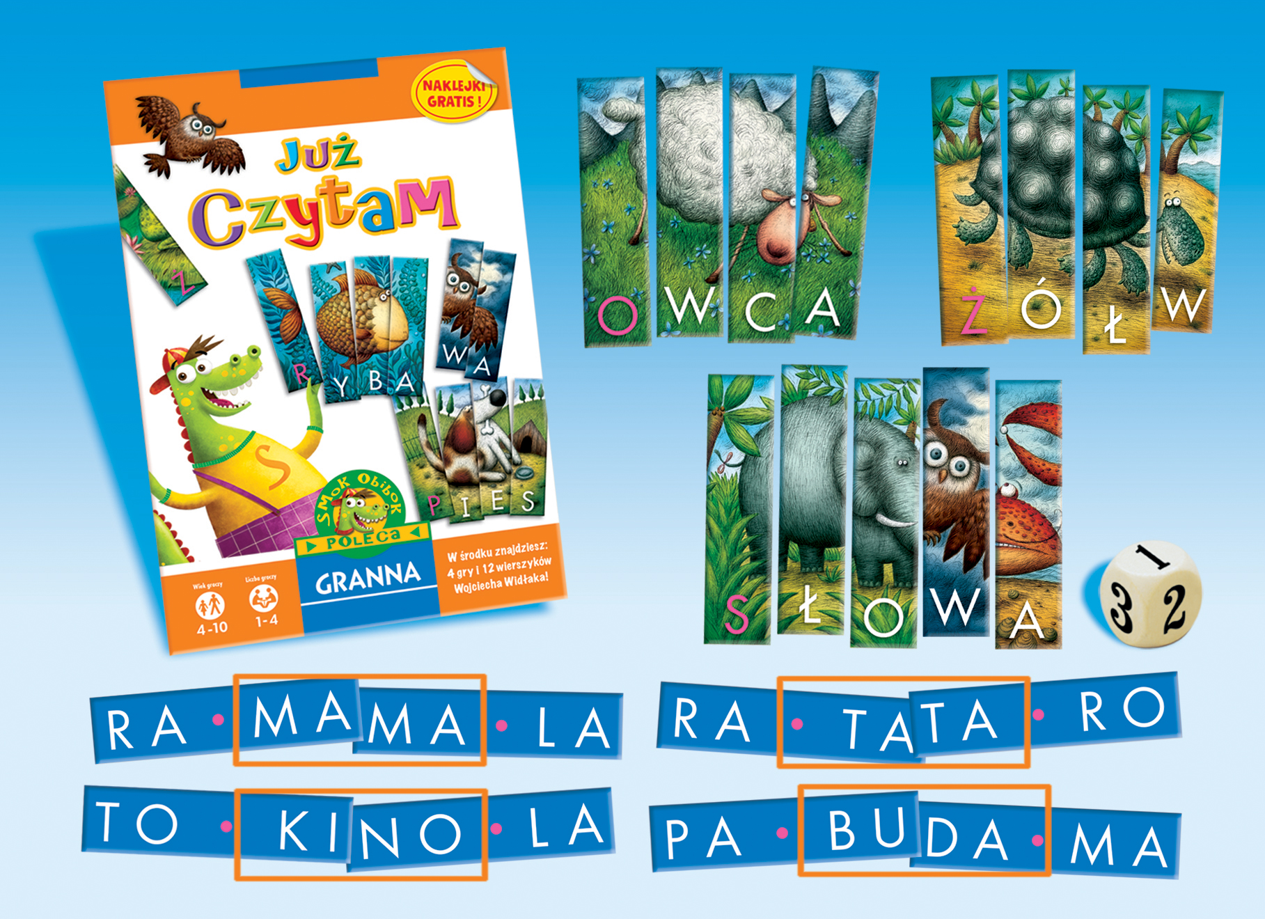 Od liter przez sylaby aż po wyrazy zapraszamy na słowną przygodę ze Smokiem Obibokiem!Czy umiecie już czytać, moi drodzy? Jeszcze nie? To nie problem!W tym pudełku znajdziecie aż cztery różne gry. Dwie pierwsze to zabawy z puzzlami, które oswoją was z kształtem liter.Kolejna to sylabowe domino, dzięki któremu nauczycie się tworzyć najprostsze wyrazy.Ostatnia zaś to prawdziwa gra słowna dla tych, którzy poznali już elementarz i wiedzą, czy Ala ma kota!Czytanie wcale nie jest takie trudne mam nadzieję, że bardzo je polubicie!