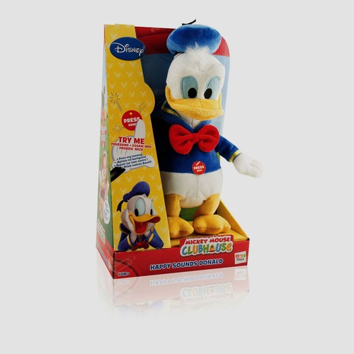 Pluszowy Kaczor Donald w pozycji stojącej. Po naciśnięciu na brzuszek śpiewa piosenkę głosem oryginalnym, z bajki.