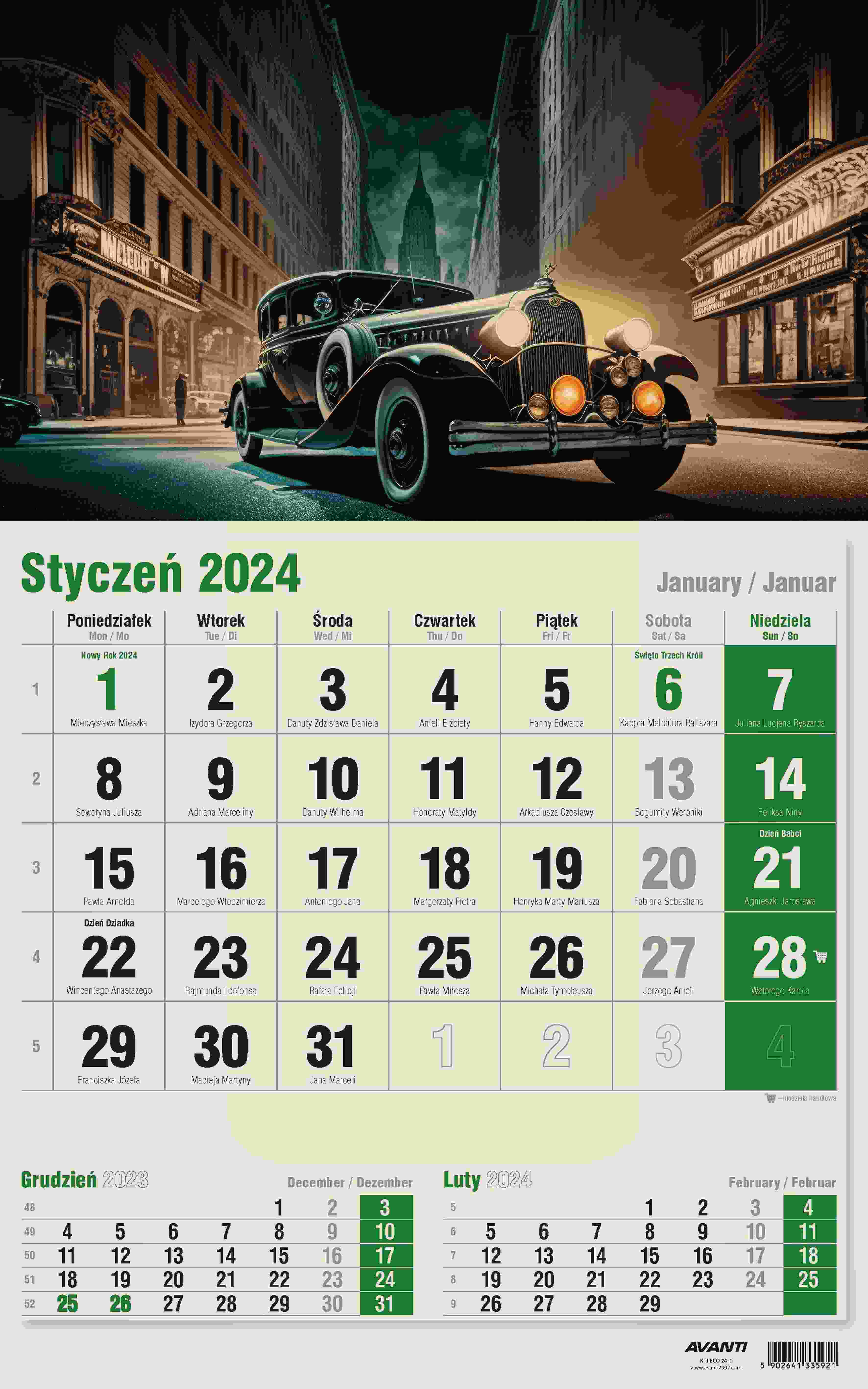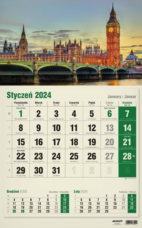Kalendarz Jednodzielny pasuje wszędzie tam, gdzie na trójdzielny brakuje miejsca, a zależy nam na podglądzie poprzedniego i następnego miesiąca. Kalendaria zawierają oznaczenia miesięcy i dni tygodnia w trzech językach (PL, EN, DE) oraz imieniny i typowe święta. Drukowany na papierze typu Kraft (ekologicznym).
