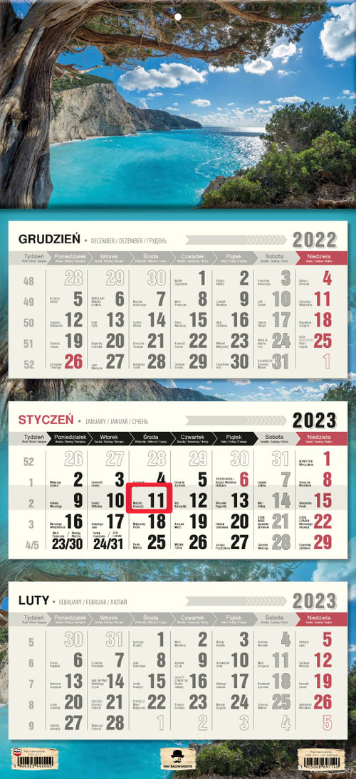 Kalendarz trójdzielny z płaską główką, format 315/680mm, główka z otworem wierconym, klasyczny układ trzech kalendariów z przesuwanym okienkiem, kalendarium wyraźne i czytelne z dużymi cyframi, posiada miejsce do notowania, dodatkowo nazwy miesięcy i dni tygodnia w języku Angielskim, Niemieckim i Ukraińskim.