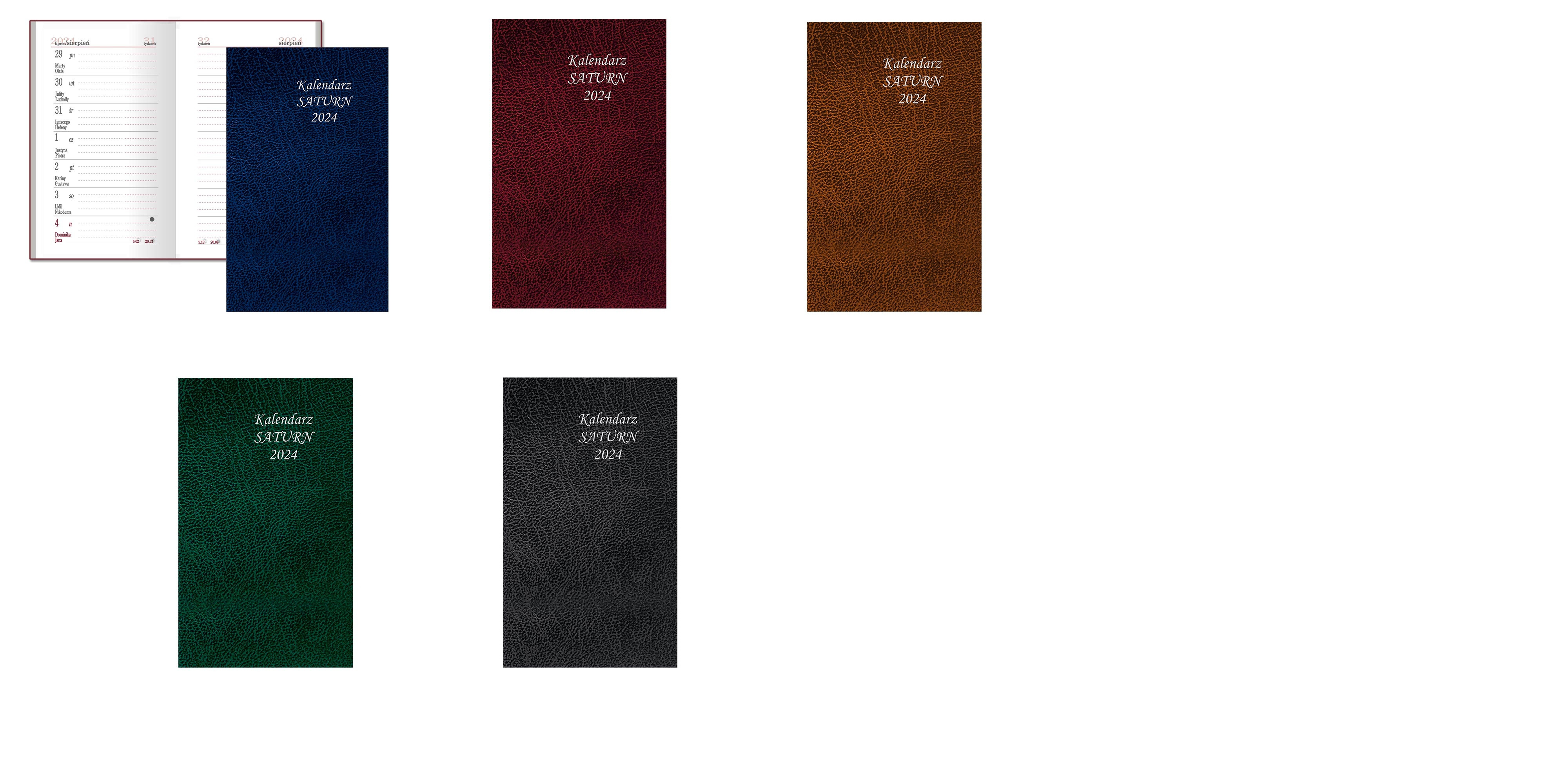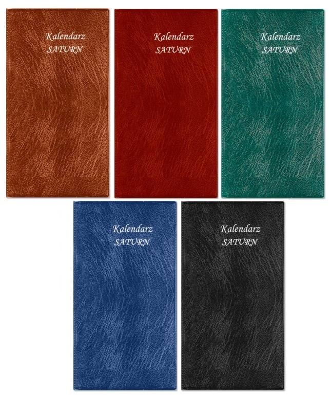 Układ 1 tydzień na stronie Druk, Papier 2 kolory, papier 70g/m2 w kolorze białym Kalendarium w języku polskim, numeracja tygodni, wschody i zachody Słońca, fazy Księżyca, podwójne imieniny Oprawa ze szlachetnych folii PCV o różnorodnym wzornictwie Część informacyjna plan roczny, miesięczny, telefony kierunkowe, skorowidz alfabetyczny, mapka z odległościami drogowymi w Polsce, kalendarz stuletni