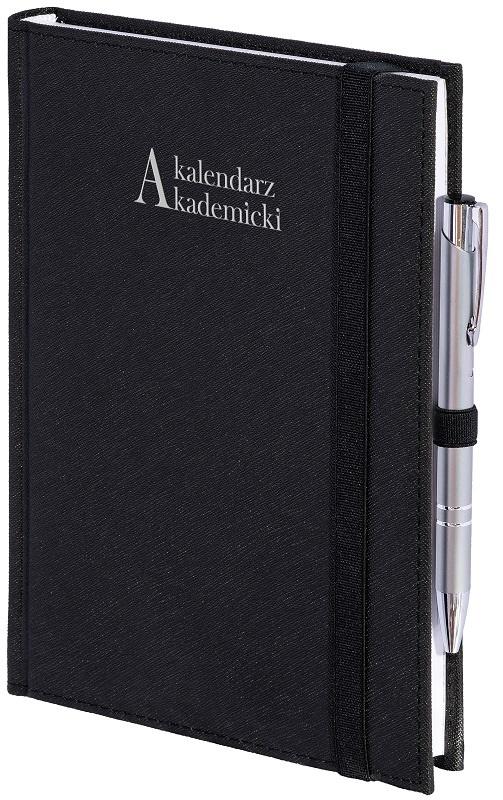 Kalendarz A5 akademicki w oprawie Cross z gumką. Tydzień na jednej stronie, druga strona na notatki. 160 stron. Papier biały. Format bloku 143x204 mm. Druk szaro- bordowy. Kalendarium od 06.09.21 do 25.09.22 r. Rozbudowana część informacyjna przydatna przy organizacji roku akademickiego. Długopis za dodatkową opłatą.