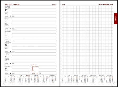 Kalendarz w oprawie Vivella. Blok kalendarza szyty nićmi. Papier biały z perforacją narożną. Kapitałka i tasiemka białe. Kalendarz posiada: barwne mapy przedstawiające Polskę i kraje europejskie; rozbudowaną część informacyjną; przejrzysty układ graficzny kalendarium.