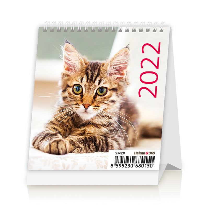 Mini kalendarz biurkowy na spirali, z obrazkami zwierząt, rozkład miesięczny.