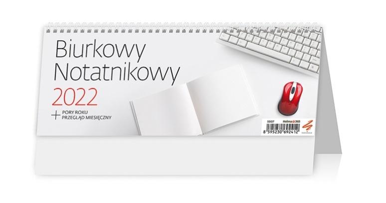 Klasyczny kalendarz biurkowy na spirali, z tygodniowym kalendarium, miejscem na dzienne notatki, wersja pozioma.