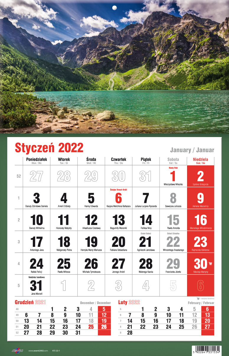 KTJ – Kalendarz Jednodzielny (3 miesiące na 1 stronie), format 310x480 mm, główka płaska. KTJ pasuje wszędzie tam, gdzie na trójdzielny brakuje miejsca, a zależy nam na podglądzie poprzedniego i następnego miesiąca. Kalendaria zawierają oznaczenia miesięcy i dni tygodnia w trzech językach (PL, EN, DE) oraz imieniny i typowe święta.